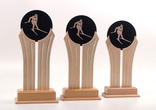 Pokale mit einem rechteckigem Sockel aus massiver Buche natur,
