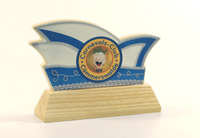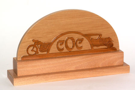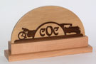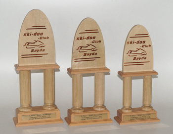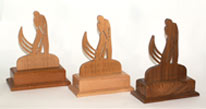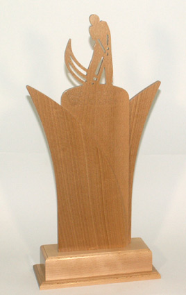 | Pokal links: Sockel Buche natur , Trägerplakette Weißbuche, Figur Kirschbaum |
