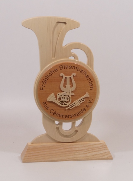 | Pokal rechts: Sockel Buche dunkel, Trägerplakette Weißbuche, Figur Buche |