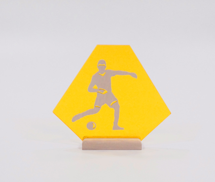 rechteckiger Sockel natur, gelbes Acrylglas, Sportsymbol Fussball |