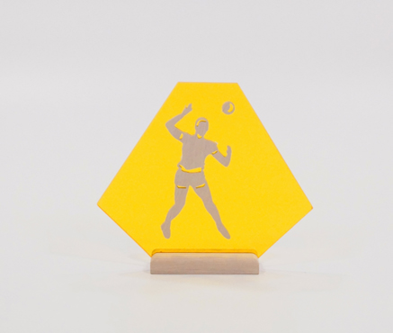 rechteckiger Sockel natur, gelbes Acrylglas, Sportsymbol Volleyball |