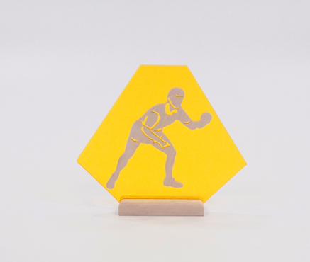 rechteckiger Sockel natur, gelbes Acrylglas, Sportsymbol Tischtennis |