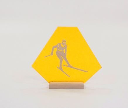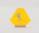rechteckiger Sockel natur, gelbes Acrylglas, Sportsymbol Skilanglauf |