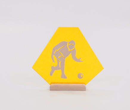 rechteckiger Sockel natur, gelbes Acrylglas, Sportsymbol Kegeln |