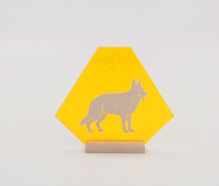 rechteckiger Sockel natur, gelbes Acrylglas, Sportsymbol Rassehunde |
