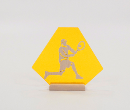 rechteckiger Sockel natur, gelbes Acrylglas, Sportsymbol Tennis |