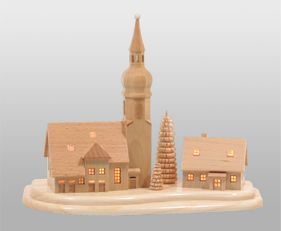 Kirche und Haus aus Buche und Weißbuche, Sockel aus Esche, natur lackiert